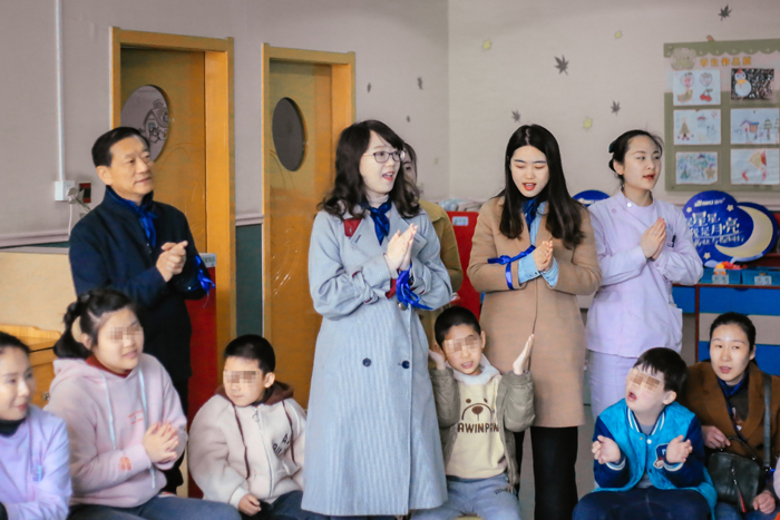 在康复中心老师的引导下,大家依次参观了学校的康复评定室、感觉统合训练室、地板时光训练室等十余种特殊训练教室。这期间,我们见到了许多自闭症儿童,有些孩子对我们这些“外来人”视而不见,但在大家耐心的沟通下,有些孩子开始有所回应,愿意与我们互动。在融合教育训练室里,我们感受了他们相较于正常孩子更难以集中注意力,难以控制自己的行为以及拒绝沟通带来的麻烦。当然,我们看到了大多数孩子无比可爱的笑脸、迎来了他们热情的拥抱。一首《虫儿飞》拉近了我们与孩子们的距离,有些能力强的孩子甚至凑在我们身边撒娇,渴望得到表扬。尽管这些“星星的孩子”困于自己的世界,但是他们并没有放弃与外界探索,拥有着属于他们这个年龄的蓬勃朝气。